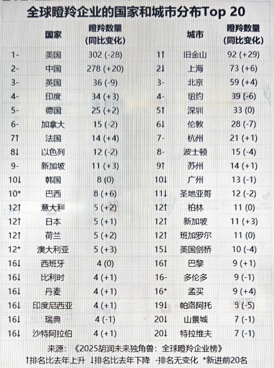 从国家来看,美国的瞪羚企业数量保持首位,但比2024年减少28家,降幅8%;中国的瞪羚企业比上年增加20家,增幅8%。英国以36家位居第三,减少9家;印度以34家紧随其后,增加3家,德国以25家位列第五,增加2家。新上榜的瞪羚企业中,美国有64家,中国有55家,印度有18家;按行业划分,金融科技29家,人工智能28家,SaaS和机器人各15家。