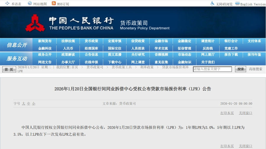 中国人民银行授权全国银行间同业拆借中心公布,2026年1月20日贷款市场报价利率(LPR)为:1年期LPR为3.0%,5年期以上LPR为3.5%。以上LPR在下一次发布LPR之前有效。