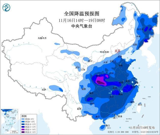 r受寒潮影响,预计,11月16日至18日,我国中东部地区将自北向南出现大风降温天气,日平均或最低气温普遍下降6~10℃,陕西南部、重庆北部、河南西部和南部、湖北西部和北部等地下降12~14℃,局地降温可超过16℃。18日前后,最低温度0℃线将南压到苏皖南部至湖北中部一带。