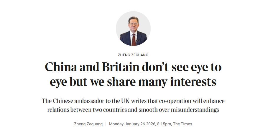 北京时间1月27日,英国《泰晤士报》刊发中国驻英国大使郑泽光关于中英关系的文章,题为《中英之间虽存在一些分歧,但更拥有众多共同利益》。该报的编者按称,中国大使指出,开展合作有助于加强两国关系并避免误解。郑泽光大使的文章全文如下: