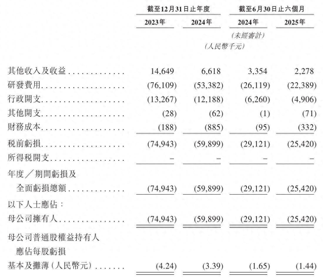 业绩方面,2023年至2025年上半年(下称“报告期”),时迈药业录得的其他收入及收益分别为1465万元、662万元和228万元,同期的亏损总额高达7494万元、5989.9万元和2542万元,累计亏损已超过1.6亿元。