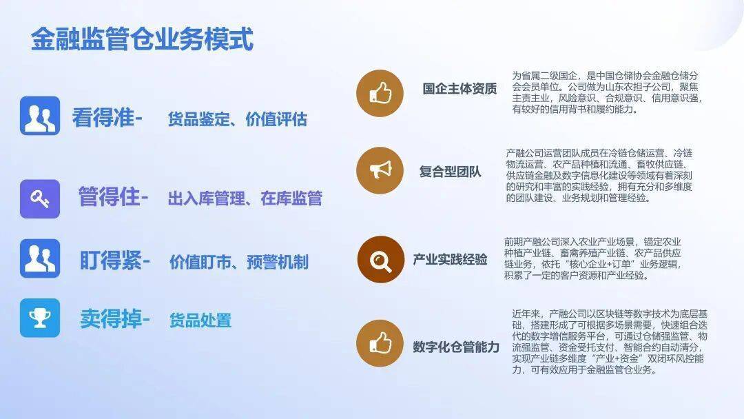 近年来,在山东省粮食和物资储备局的指导下,山东省农业发展信贷担保有限责任公司深入调研粮食流通,精准匹配业务场景,创新开发金融服务,由权属公司鲁担(山东)城乡冷链产融有限公司为载体,以 “政策性定位、市场化运作”践行政治责任,全面开展粮食仓单质押监管、动产质押监管运营服务,陆续与国有银行、城商行、担保公司、小贷公司、国企等建立直接合作关系。截至目前,已通过存货监管为全省 126 家粮企盘活粮食存货 15.7 亿元。